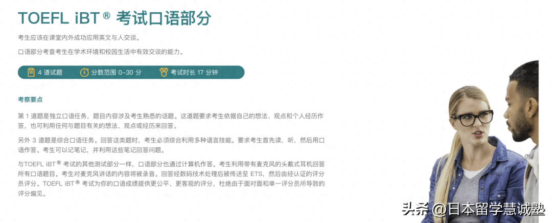 根据官网,TOEFL iBT考试的口语主要考查考生在学术环境和校园生活中的英文交流能力。4道试题分数范围0-30分,考试时长17分钟。