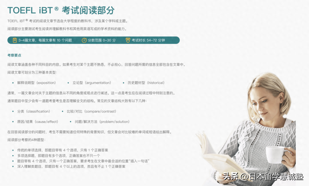 慧诚酱划重点:阅读部分会有3-4篇文章,每篇文章有 10 个问题,分数范围 0-30分,考试时长 54-72分钟。