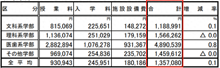 在私立大学中,会根据大学和学部的不同学费也会有很大的不同。此前文部科学省大致从文科、理科、医齿系、其他(家政、保健、体育、艺术系)学部,给出了学费平均值的数据,下面来看看吧。