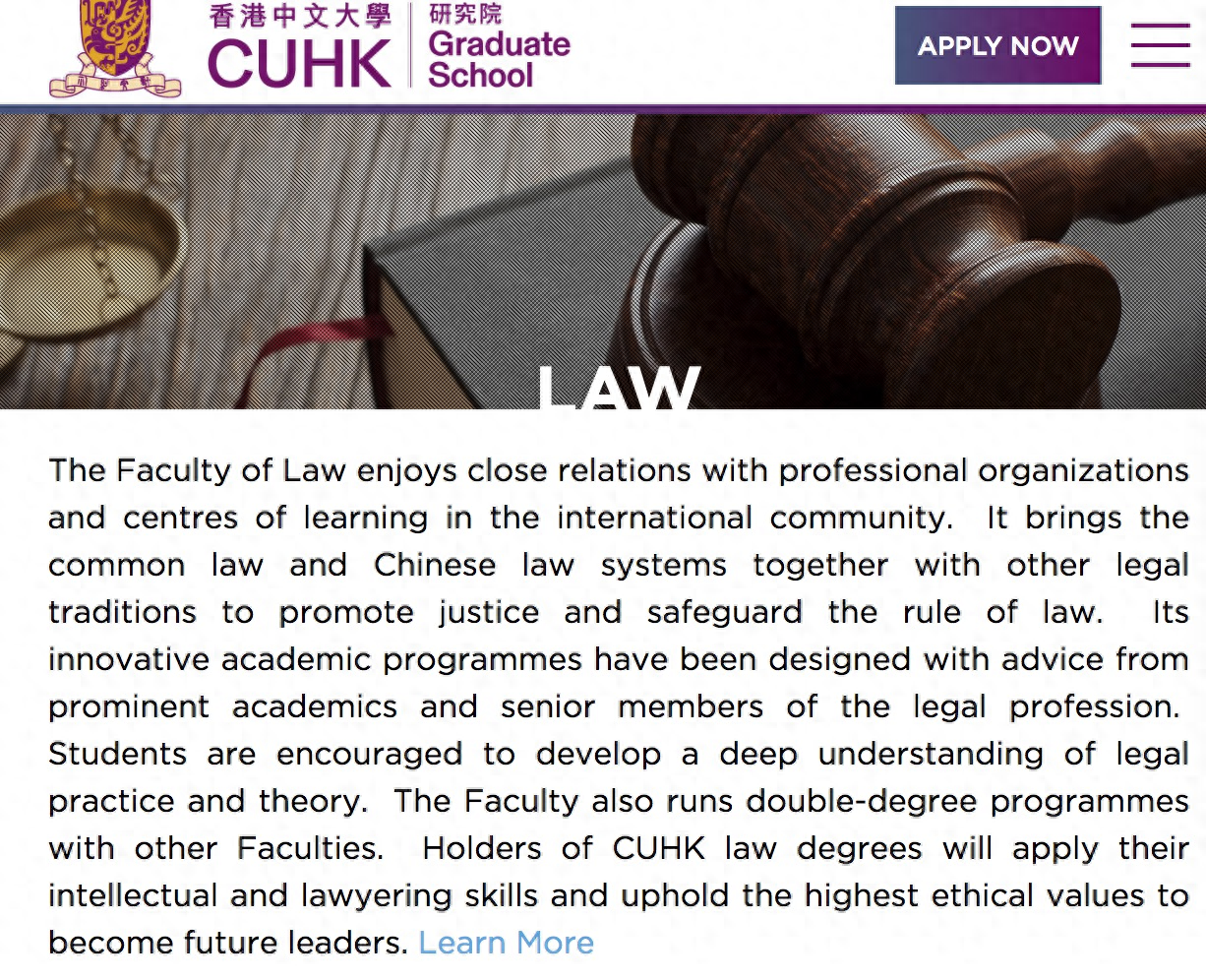 法学专业在申请上有一定的限制,从申请人的角度来看,要么是本专业申请,要么需要具备相关行业经验;从学校的角度来看,法学专业的设置需要具备极强的应用性。因此,在香港的八所大学中,只有香港大学、香港中文大学和香港城市大学这三所学校开设法学专业,申请要求也相对较高。