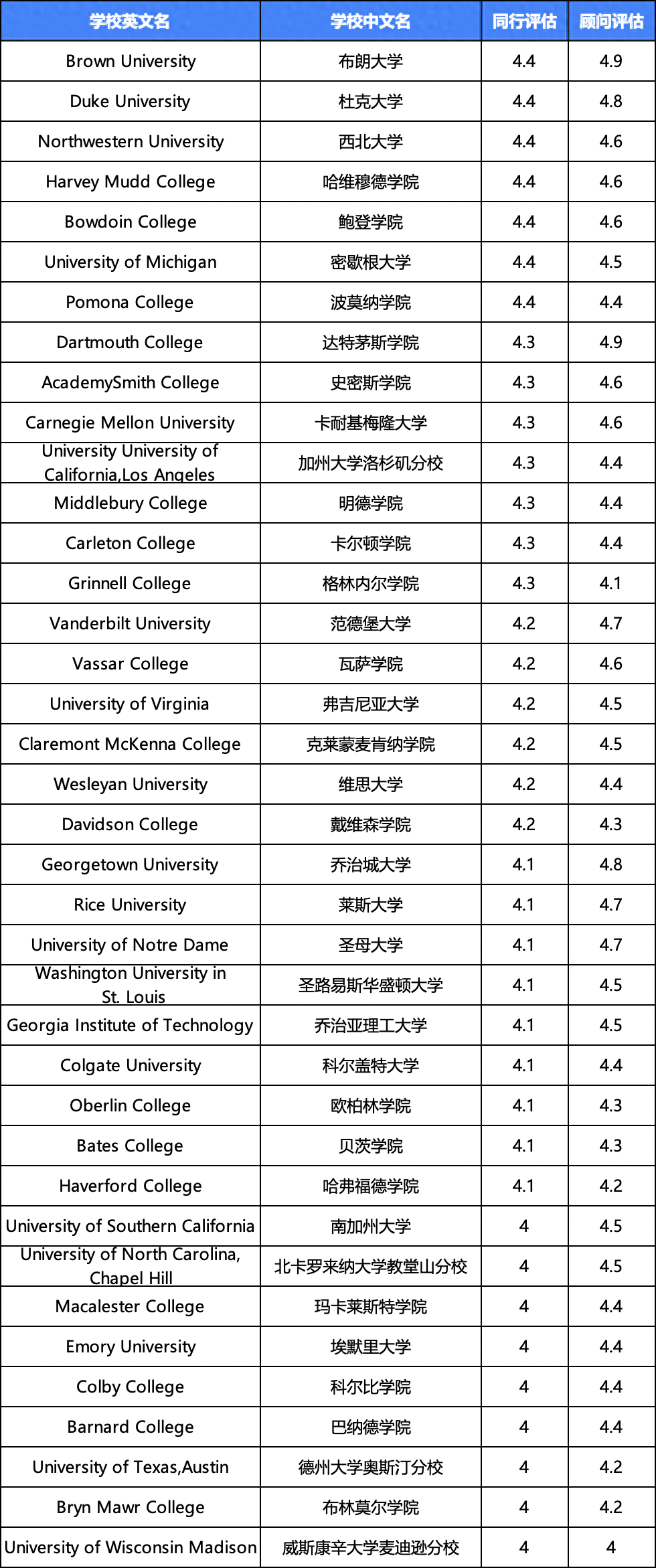 所以大家非常有必要参考U.S.News收集整理的Peer Assessment(同行评审)和Counselor Assessment(升学顾问评价)数据!