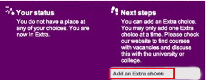 如果已经递交了五个申请,但都没有录取,或者拒绝所有Offer。之后,学生可以登录账号进入Choice section,然后可以看到一个“Add Extra Choice”(添加额外选择)的选项,点击它再选择想申请大学的相关专业即可。