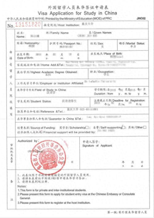 《外国留学人员来华签证申请表》(见下图)审核通过后将会把其中一联寄给申请留学的外国人,此外国人凭此联向我国驻外签证机关申请学习签证。拿到签证后,便可带齐录取通知书等相关资料来华留学。