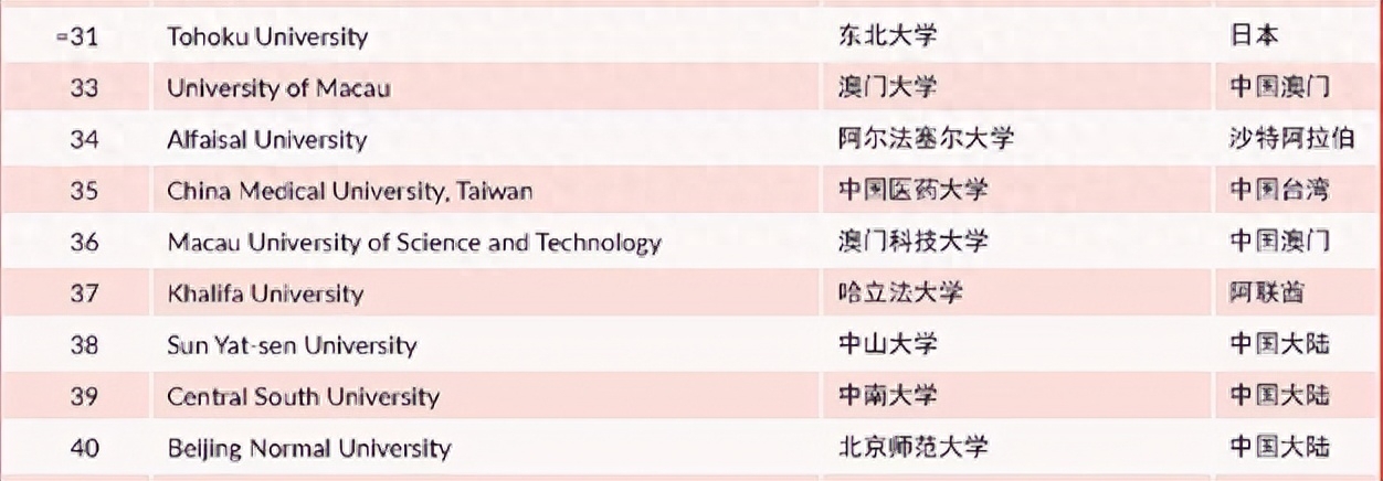 澳门大学作为一所比较年轻的大学,建校历史不到40年,新校区成立也不过8年时间,但是凭借着强大的实力,国际排名突飞猛进,在2022年THE亚洲大学排名中进入了TOP50,排在第33名,甚至还超越了中山大学、中南大学、北京师范大学等多所国内知名的985/211院校。