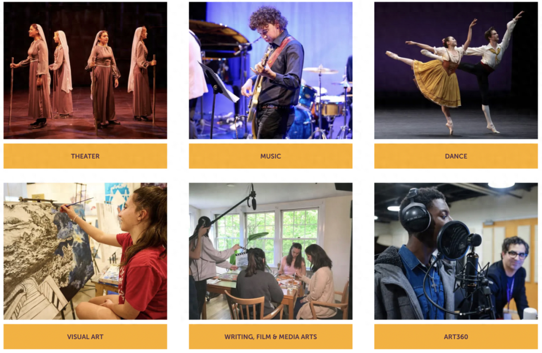 古典乐、爵士乐、写歌、视觉艺术、表演、音乐剧、设计与制作、舞蹈、电影和数字媒体、时 尚设计、跨学科艺术。