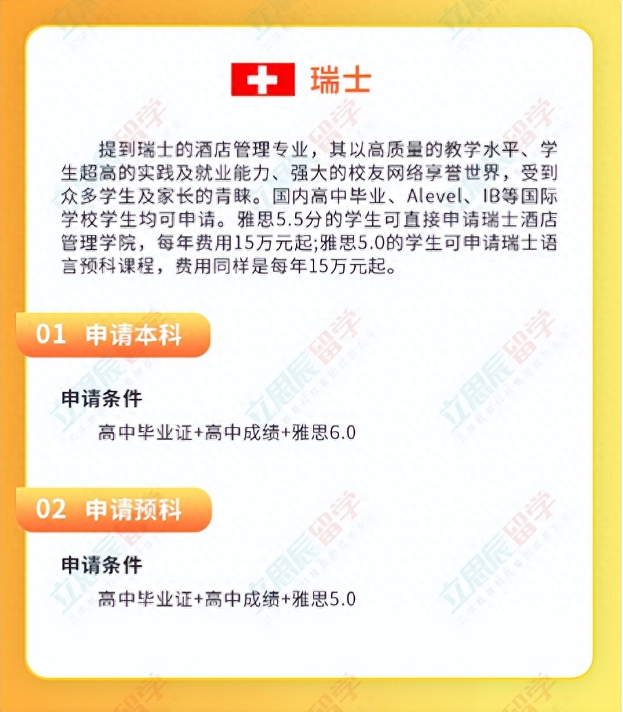 立思辰留学瑞士部的老师们最近也接受到了很多学生家长关于高考成绩申请瑞士留学的咨询,提到瑞士的酒店管理专业,其以高质量的教学水平、学生超高的实践及就业能力、强大的校友网络享誉世界,受到众多学生及家长的青睐。国内高中毕业、Alevel、IB等国际学校学生均可申请。雅思5.5分的学生可直接申请瑞士酒店管理学院,每年费用15万元起;雅思5.0的学生可申请瑞士语言预科课程,费用同样是每年15万元起。