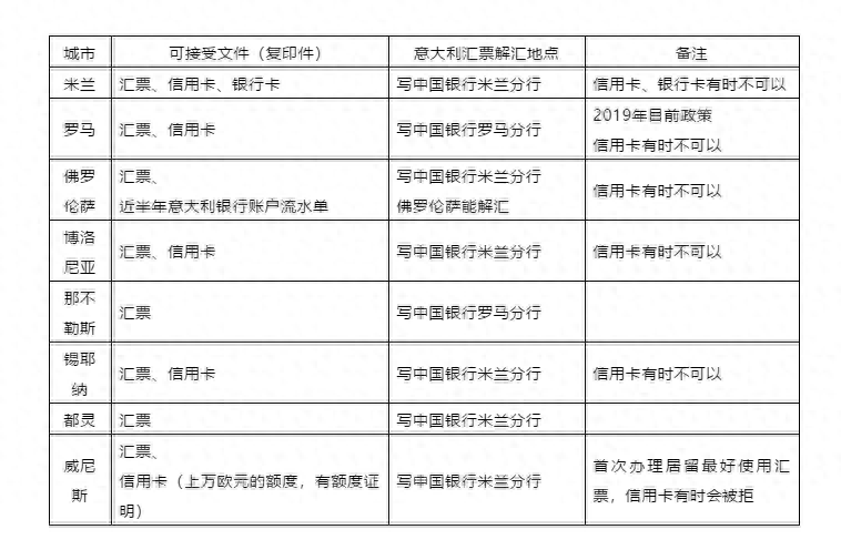 意大利很多城市,办理居留时不见得必须要提交汇票这种形式的资金证明,也可以提交其他形式的资金证明,但各自要求不同。比如佛罗伦萨,可以提供近半年的意大利银行账户的流水单。比如都灵,可提供信用卡复印件。鉴于各城市要求不同,最简单的处理方式,就是让赴意大利的学生办理汇票,并且按照最高额度6000欧元办理,中国银行米兰/罗马分行解汇。不是所有的银行都能提供汇票业务,目前得知能办理汇票业务的有中国银行的部分分行、花旗银行。