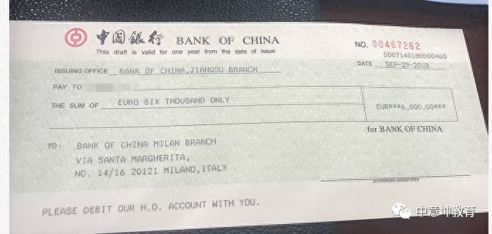 2. 银行系统默认是法兰克福,是欧洲清算中心,学生汇票时候要提醒工作人员手动选意大利,不会的话让工作人员咨询南京中国银行总行。