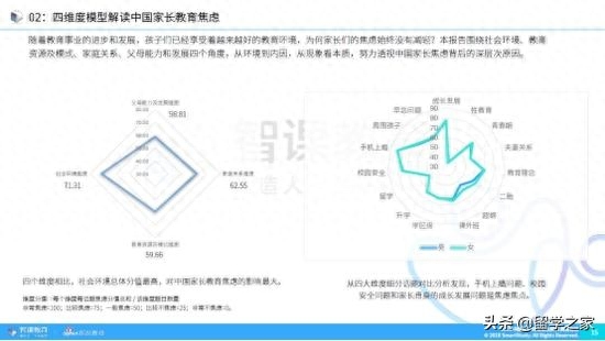 现如今,互联网在线教育技术日趋成熟,先进的国际教育理念在国内的普及率也越来越高,然而家长们在孩子教育上的焦虑却有增无减。围绕父母能力、亲子关系、社会环境、教育资源四个维度展开调研和论述,旨在透过现象看本质,找到中国家长教育焦虑背后的真正原因。数据显示,社会环境因素以71.31的分值成为国内家长教育焦虑指数最高的领域。其中,校园安全和手机上瘾问题成为众多焦虑因素中的焦点。
