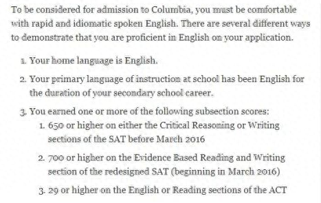 SAT Critical Reasoning 或者Writing 成绩高于650分(2016年3月之前的老SAT);或者SAT Evidence based Reading 和 Writing成绩高于700分(2016年3月之后的新SAT);或者ACT English或者Reading单项成绩高于29分。