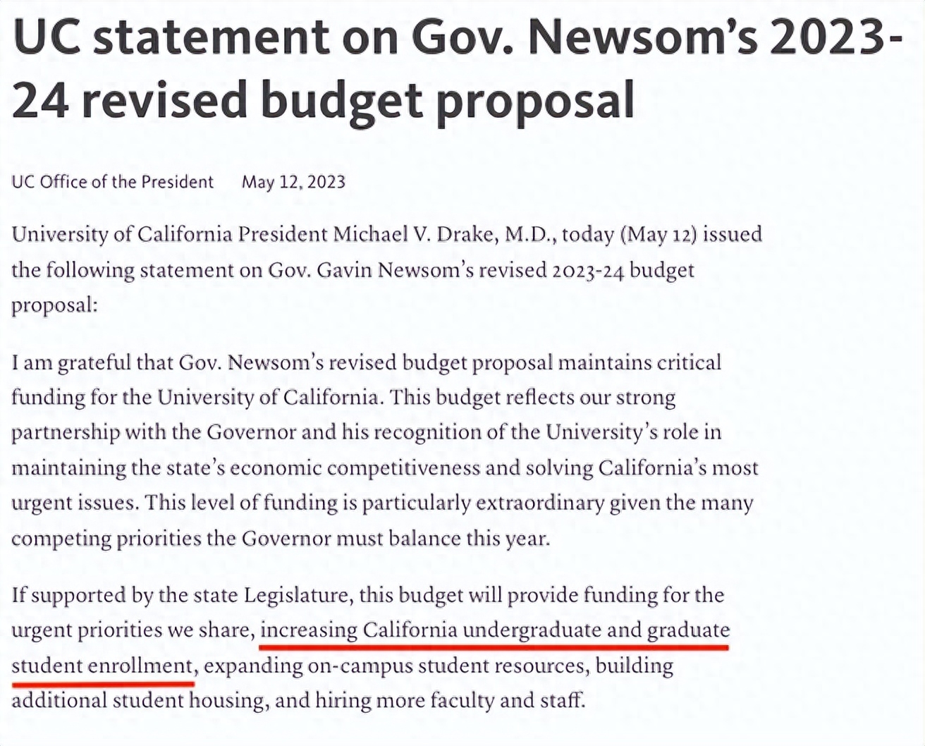 根据最新方案,加州政府在2023-2024年度将向加州三大高等教育系统——加州大学(University of California)、加州州立大学(California State University)以及加州社区大学系统提供总计超过400亿美元的拨款。