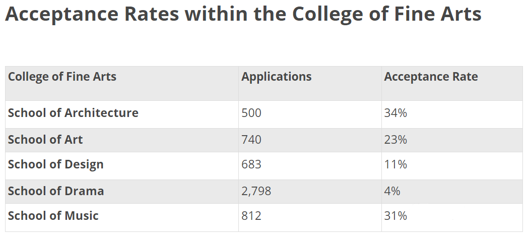 卡梅的申请难度不低,美术学院的每个细分学院录取率都不算高,尤其戏剧学院,2020 Fall仅4%,有意向的同学千万不能掉以轻心!
