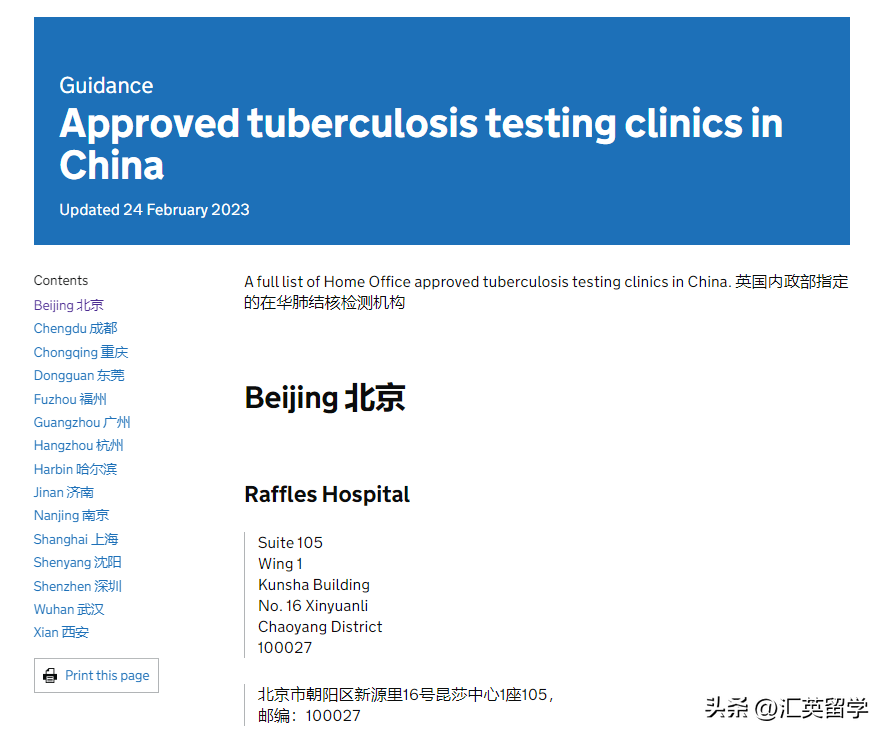 必须在英国官方指定的检验机构进行肺结核检测,目前国内共15个城市点,指定检测机构的具体地址和联系方式可以在英国政府官网获取。