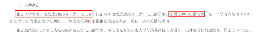 雅思(学术类)成绩达到6.5分及以上的同学,报名费可以全额报销,同时还可以优先参加河南大学与国外高校的交流项目,可以说拿到一个雅思成绩,简直能够一举两得!