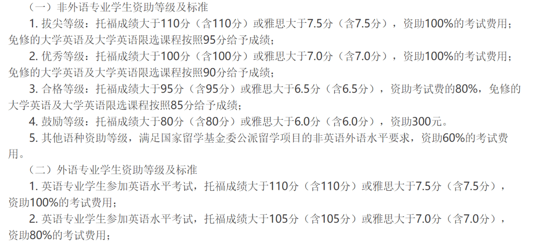 优秀等级:雅思7.0分及以上,资助100%的考试费用;免修的大学英语及大学英语限选课程按照90分给予成绩;