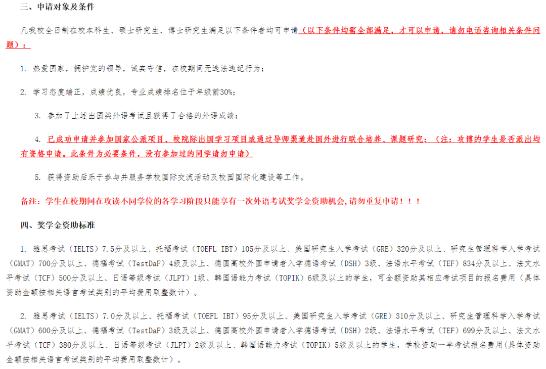 申请学生的专业成绩排名位于年级前30%,雅思成绩达到7.5分及以上,就可全额报销报名费;雅思成绩达到7.0分及以上可报销考试报名费用的一半。