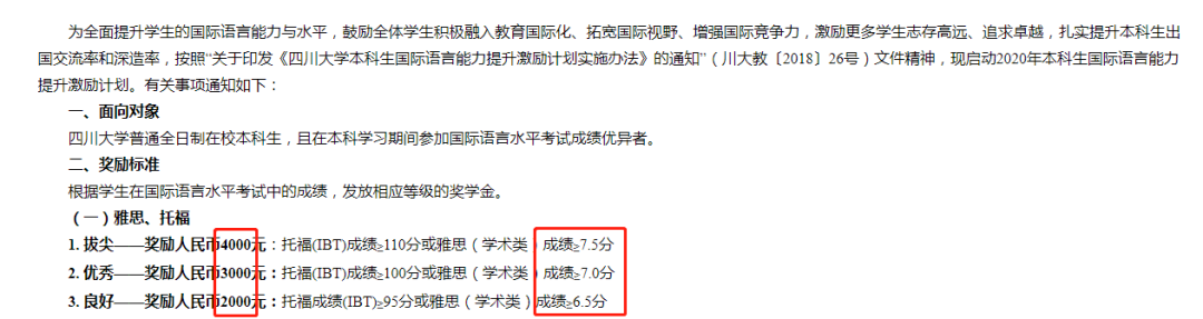 四川大学每年都会发布《本科生国际语言能力提升激励计划》,以提升学生的国际语言能力和水平,考雅思取得一定成绩后可获取对应分数段奖学金。只要你雅思考到7分及以上,不仅能抵雅思报名费,还有得赚!