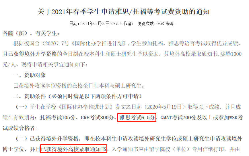 河南大学的“学生雅思/托福考试资助项目”会对在雅思、托福考试中取得优异成绩的学生予以资助,资助对象包括:全日制在校统招本科生、硕士研究生、博士研究生。