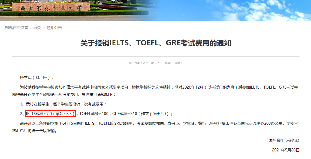 早在2014年,西北农林科技大学就开始对在雅思、托福及GRE考试中取得高分的学生,予以报销一次考试费用的福利,目的就是鼓励学生积极参加国际英语考试并申报国家公派出国项目。