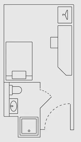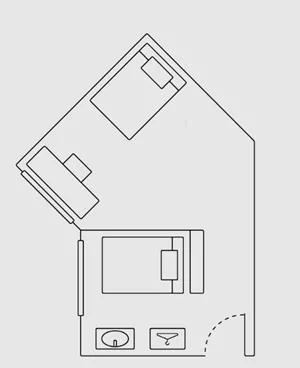 还有一种是一个大一些的套间,里面有两张床(住两个人),两人共用一个洗手池。以下为平面图示例: