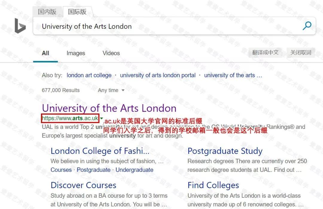 首先我们需要找到伦敦艺术大学的官网,一般在百度上搜索一定会先出现各种中介词条,因此Clair推荐大家使用Bing搜索引擎(https://cn.bing.com/)。它分为国际版和国内版,在国际版内输入伦敦艺术大学的英文名University of the Arts London——