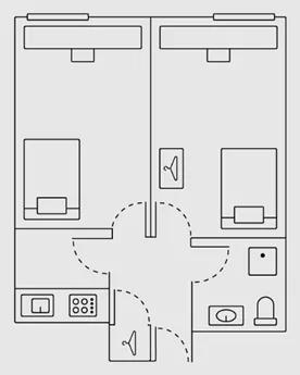 这是一个套间房型,分为两个卧室,两人共享卫生间以及厨房。这个房型每年申请的人数极多,但房间有限,极其抢手。