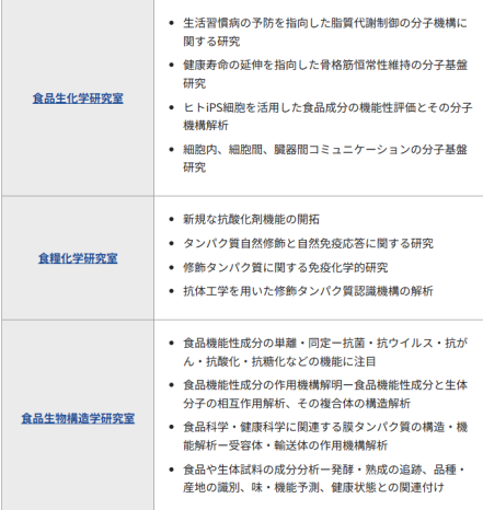 北海道大学的农学院历史悠久,围绕生产、生命、环境三大课程展开研究,其中生命课程中含有应用食品科学研究室、食品营养学研究室、食品功能化学研究室。食品营养学研究室的加藤英介教授对有效预防糖尿病的天然有机化合物进行探索、合成、分析,为健康食品的研发提供方向。大学院的课程中会学习食品加工工学、食品安全开发、食品科学、食品微生物学相关知识,并通过实验、演习等授课方式理解食品科学的应用。