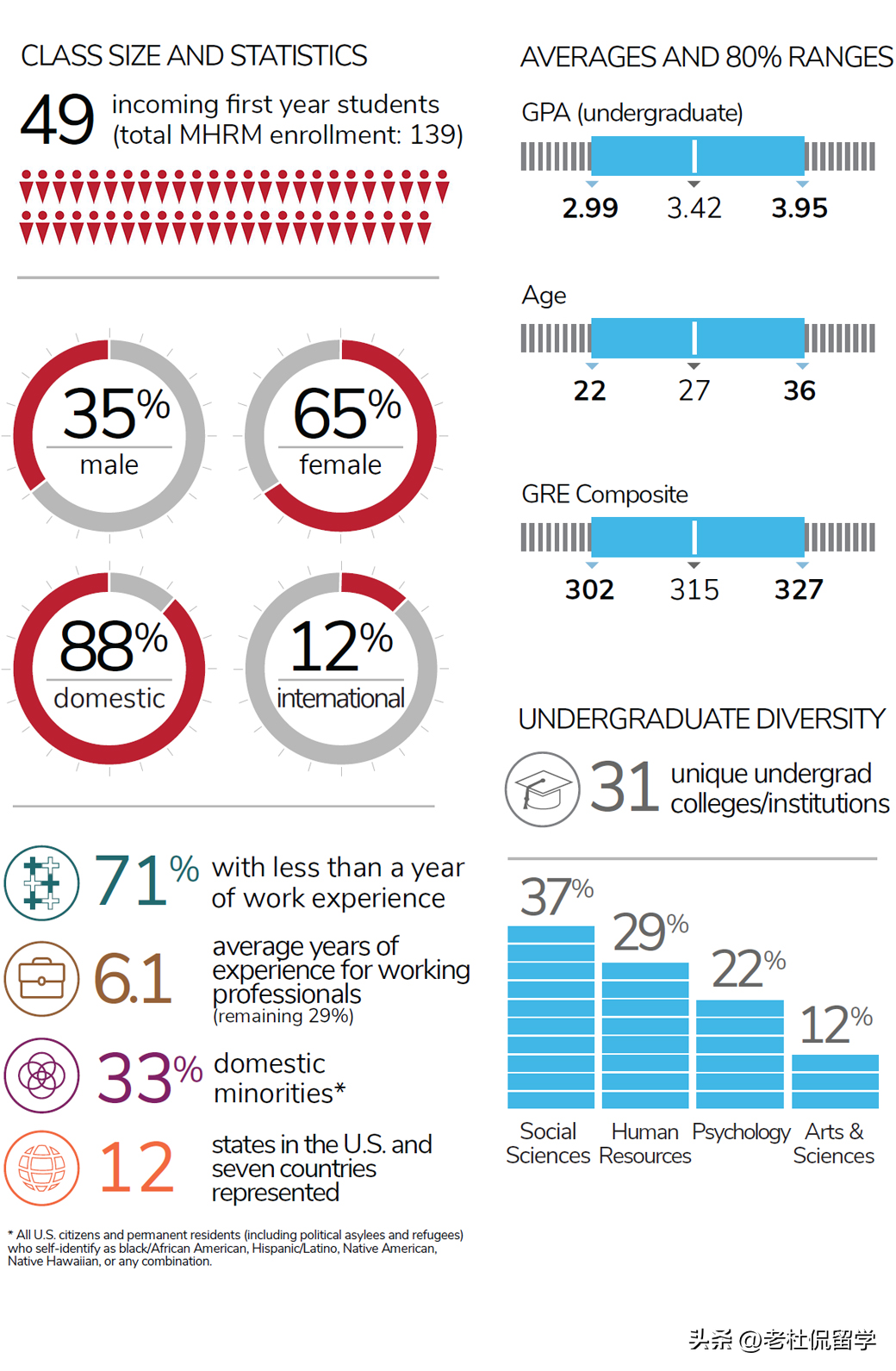 俄亥俄州立大学的人力资源管理硕士开设在商学院,相比较些大牛学校来讲。该项目并不容易申请。第一招生规模不大,小班授课不到50人。第二 GPA要求基本在>3.4以上,同时需要提供GRE或GMAT成绩,国际生比例只有12%。下图是官网给的录取相关数据。