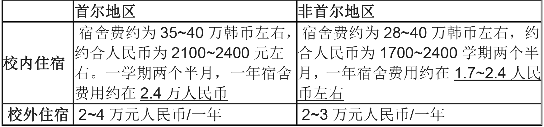 ※ 不管是在首尔还是地方地区,在校内住宿相对来说普遍比在校外居住更便宜。但是首尔地区的校内宿舍不如地方学校的宿舍数量充足,非常难申请。