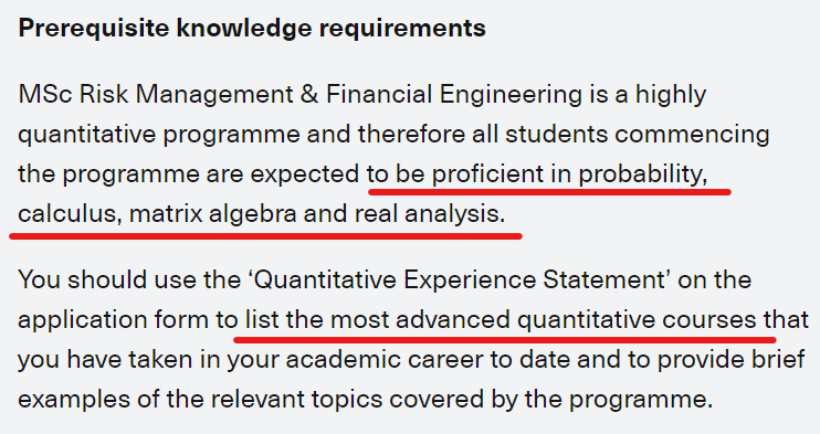 比如帝国理工商学院的【MSc Risk Management & Financial Engineering】课程,需要申请人精通概率、微积分、矩阵代数这些专业知识,需要在申请表上填写学习过的量化课程&拿到的分数。