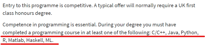 比如帝国理工“金融科技”专业、爱丁堡“人工智能”专业等等,都要求申请人具备Java、Python、R等编程技能,如不具备则申请不被考虑。