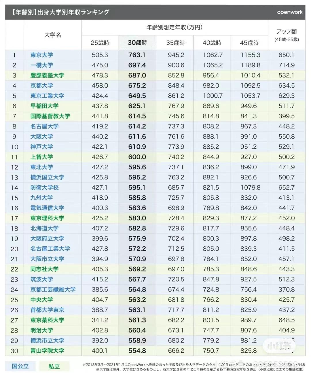 到了30岁的职场黄金期,排名前十的学校分别是东京大学(763万)、一桥大学(697万)、庆应义塾大学(687万)、京都大学(675万)、东京工业大学(649万)、早稻田大学(625万)、国际基督教大学(614万)、名古屋大学(614万)、大阪大学(611万)、神户大学610万。年薪均在600万日元以上。