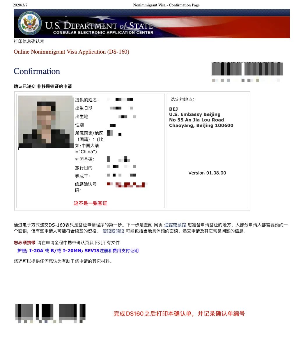 下载打印后的DS-160申请表如下图,此表是申请签证的必备文件,需要携带到大使馆参加面签。