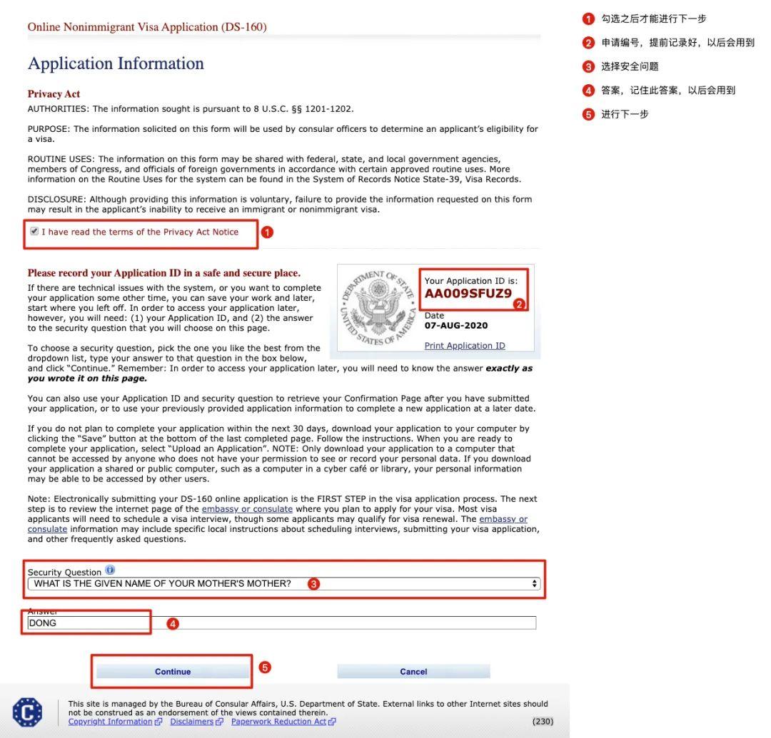 设置好Security Question,记住问题答案,后续调出申请时会用到,然后就可以点Continue,请注意:在填写申请表的过程中,如果长时间未操作或者网络中断,申请流程将被终止。除非你提前记录申请号和对应的Security Question答案,或已将申请存入电脑文件,否则之前填写的内容将全部丢失。请务必记下页面右上角显示的AA开头申请编号,建议在填写过程中经常点击save及时保存。