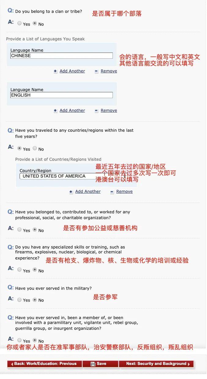 到这里我们的DS-160表的个人信息基本完成,背景调查一共五部分,一般人均选择NO,所以省略不再截图说明。