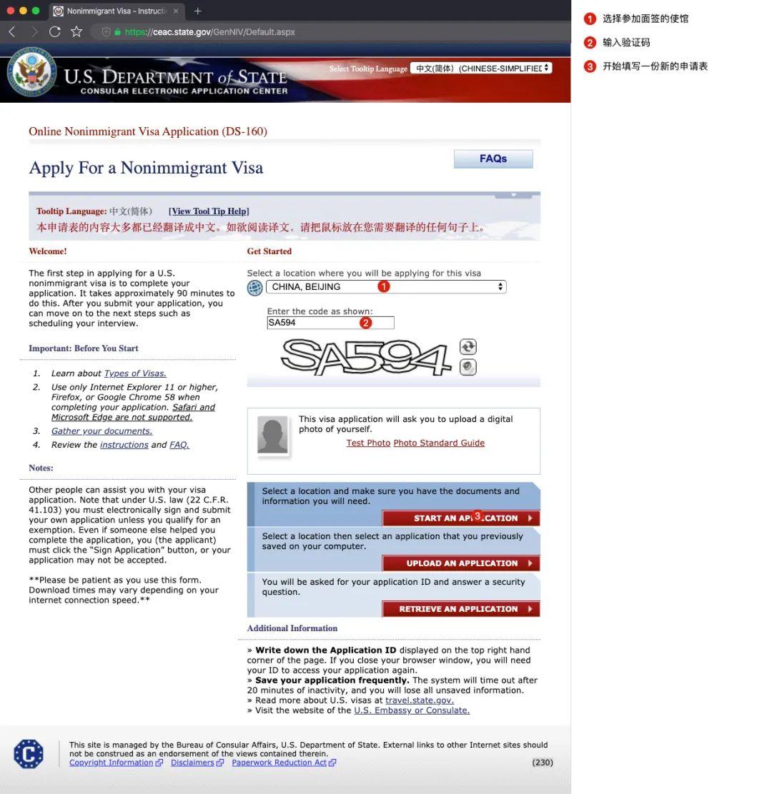 在右上角选择语言为简体中文便于填写,在Select a location一项选择要去面签的使馆,如:CHINA, BEIJING,接着点击Start an application开始申请。以下步骤所有图片可点击看大图