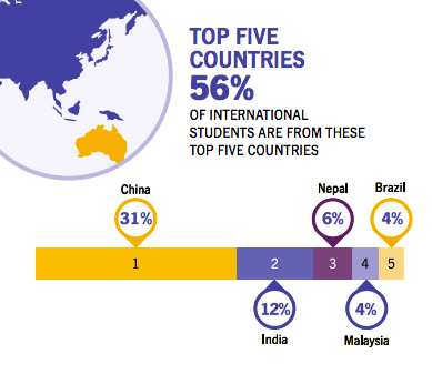 在澳洲留学的国际学生人数前五的国家,第一名的当然是中国
