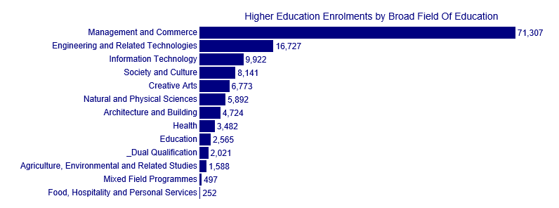 人数最多的专业是Management & Commerce,其次是Engineering和IT