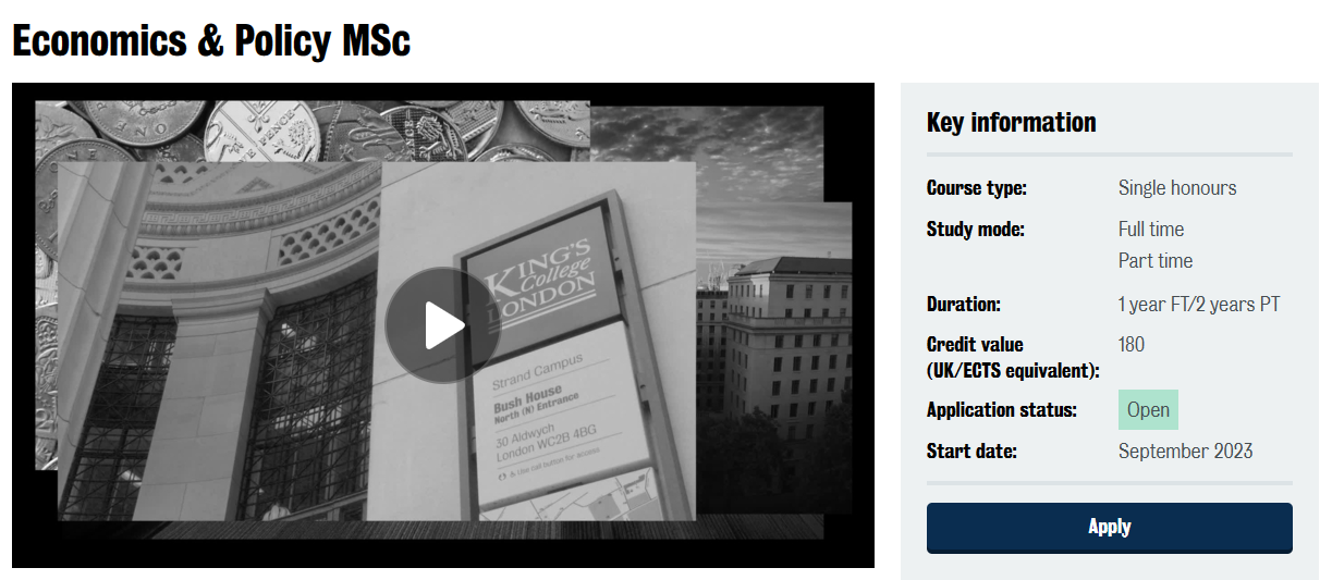 KCL商学院的王牌专业, 经济与金融硕士MSc in Economics and Finance 的一直是国内学子竞争激烈的专业之一。KCL今年商学院的录取要求提高了, 国内双一流/211/985院校均分要求为85%以上,双非院校为88% 以上。