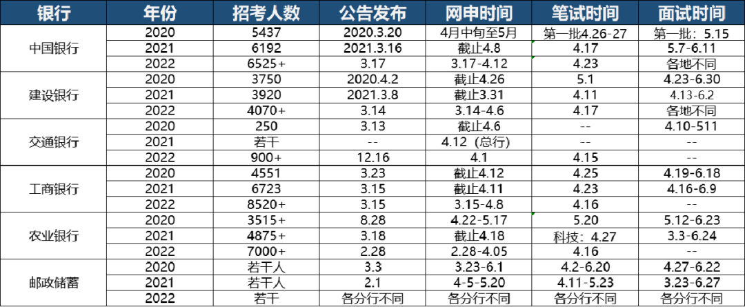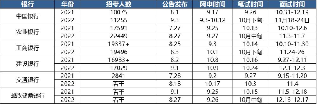 银行招聘分为秋招和春招。以历年银行秋招为例,预计在8月底之前发布,网申时间预计在8月底-10月中旬,笔试时间预计在10月下旬,面试时间预计在11月中上旬。