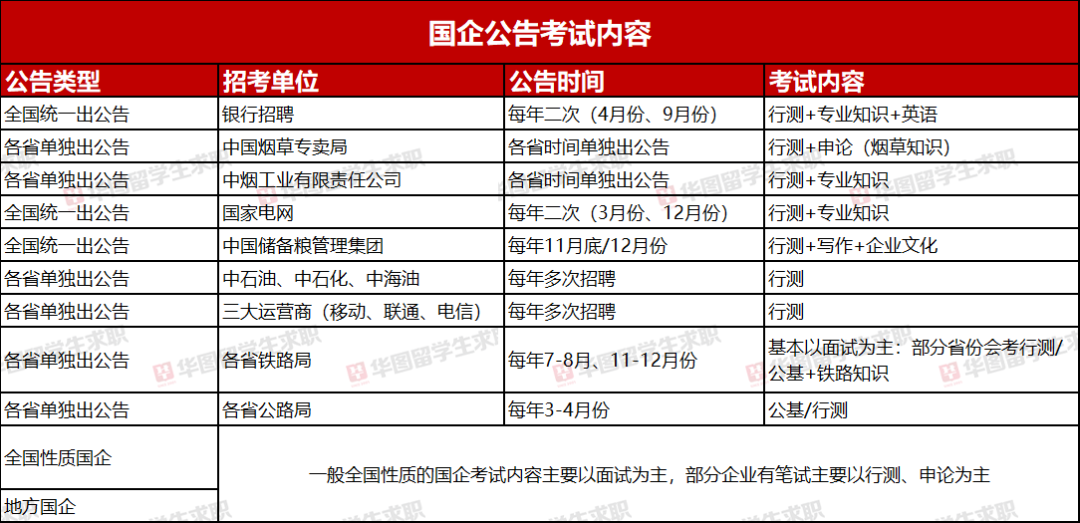 一般的全国性质国企,比如三大运营商、中石油中石化、中储粮、国家电网等,考试内容主要以面试为主,部分企业有笔试;笔试内容主要以行测、申论为主。