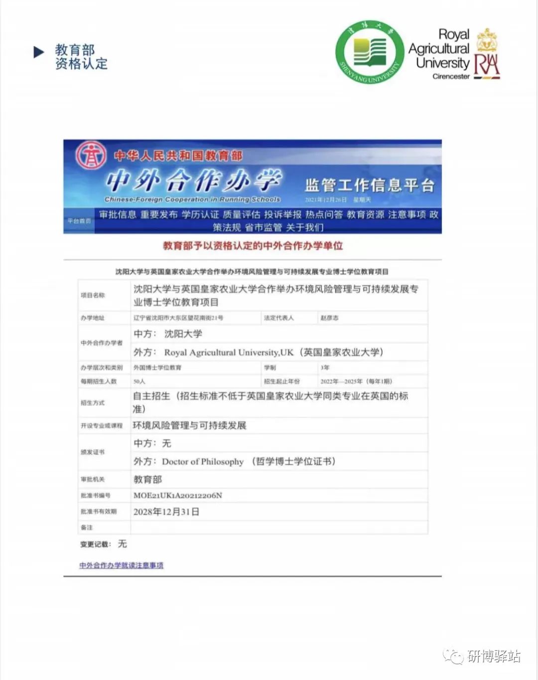 “在研究生报考压力越来越大的情况下,国内升博的压力会越来越大,以后会是优中选优的状态,而不想出国读博的学生,在国内考不上的情况下,可以选择中外合作办学3+0的博士项目,以下给大家聊一下沈阳大学与英国皇家农业大学的合作办学博士项目。”