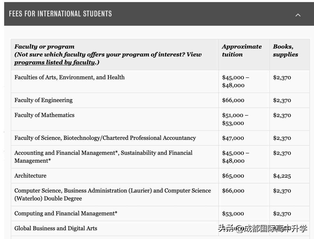 - 学费:25-35万/年(以滑铁卢大学为例)- 住宿费+生活费:10-20万/年