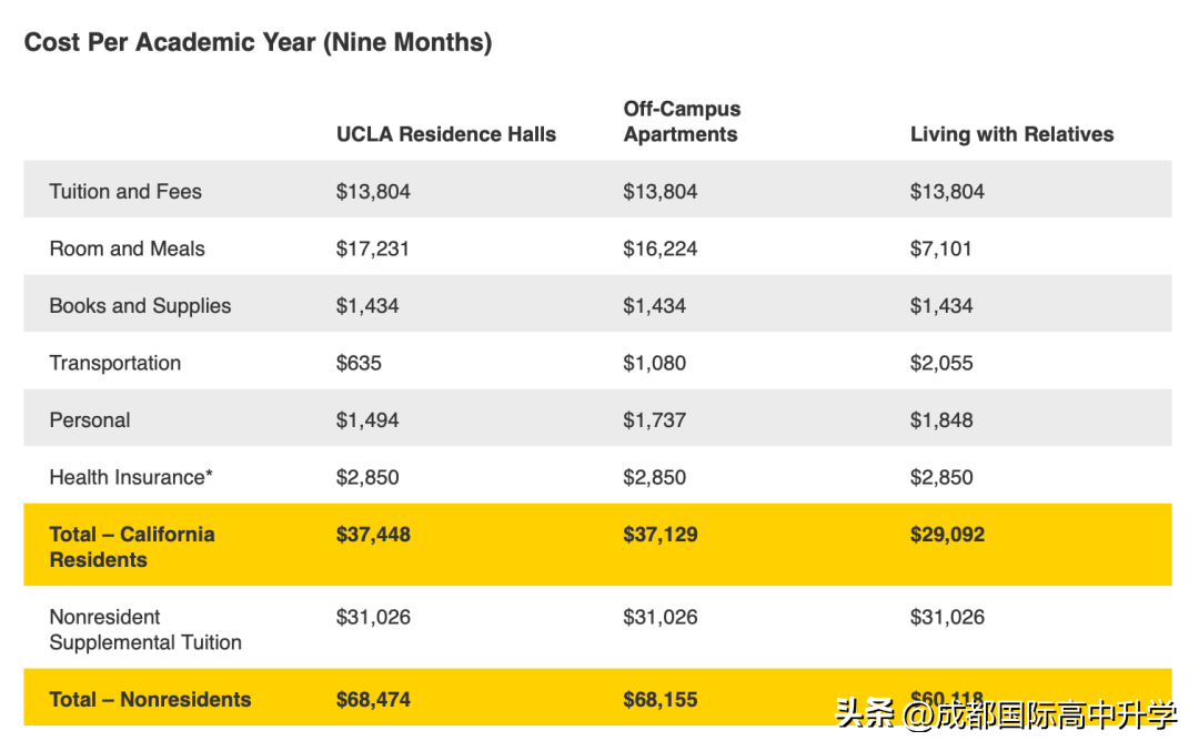 - 学费:30-60万/年(以加州大学洛杉矶分校为例)- 住宿费+生活费:不同地理位置差异较大,通常15-20万/年