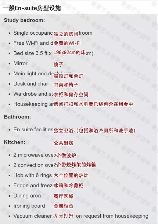 以下是英国的东安格利亚大学(UEA)的En-suite房型设施说明,其他学校大同小异: