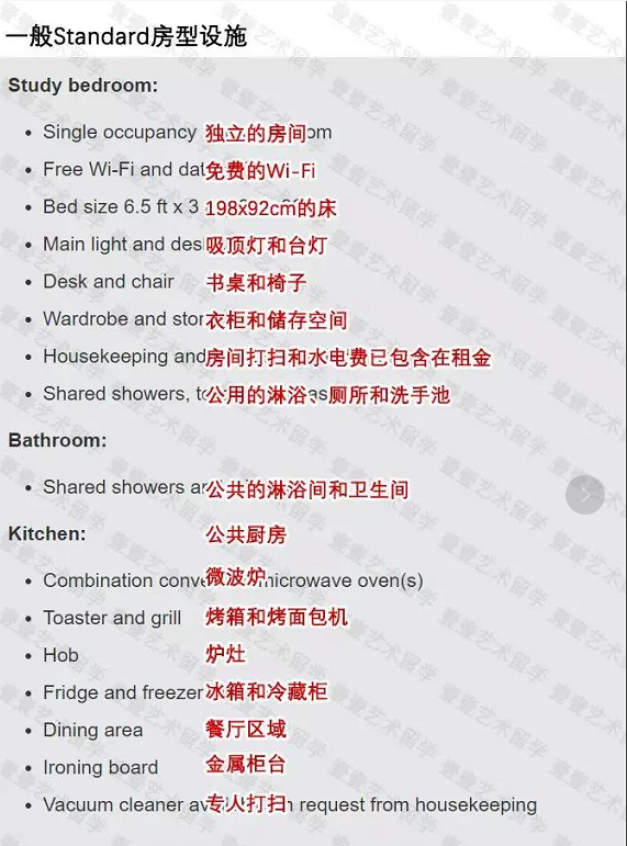 以下是英国的东安格利亚大学(UEA)的Standard房型设施说明,其他学校大同小异: