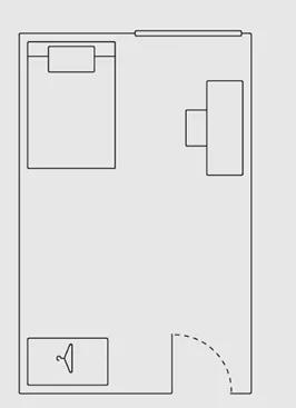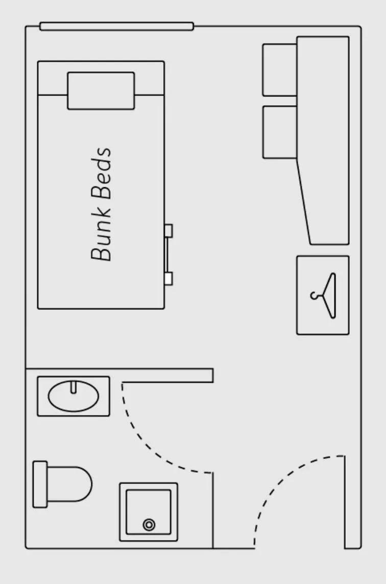 还有一种是一个大一些的套间,里面有两张床(住两个人),两人共用一个洗手池。以下为平面图示例: