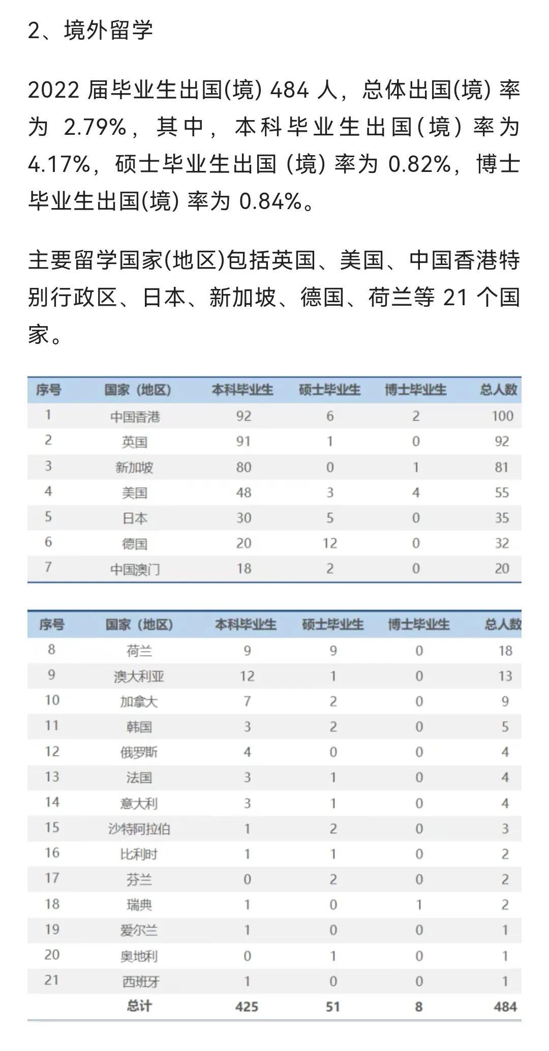 主要留学国家和地区有香港、英国、新加坡、美国等。从表中可见,吉林大学境外留学主要在港英新澳方向,四地本科生留学273人,占比超过64%。