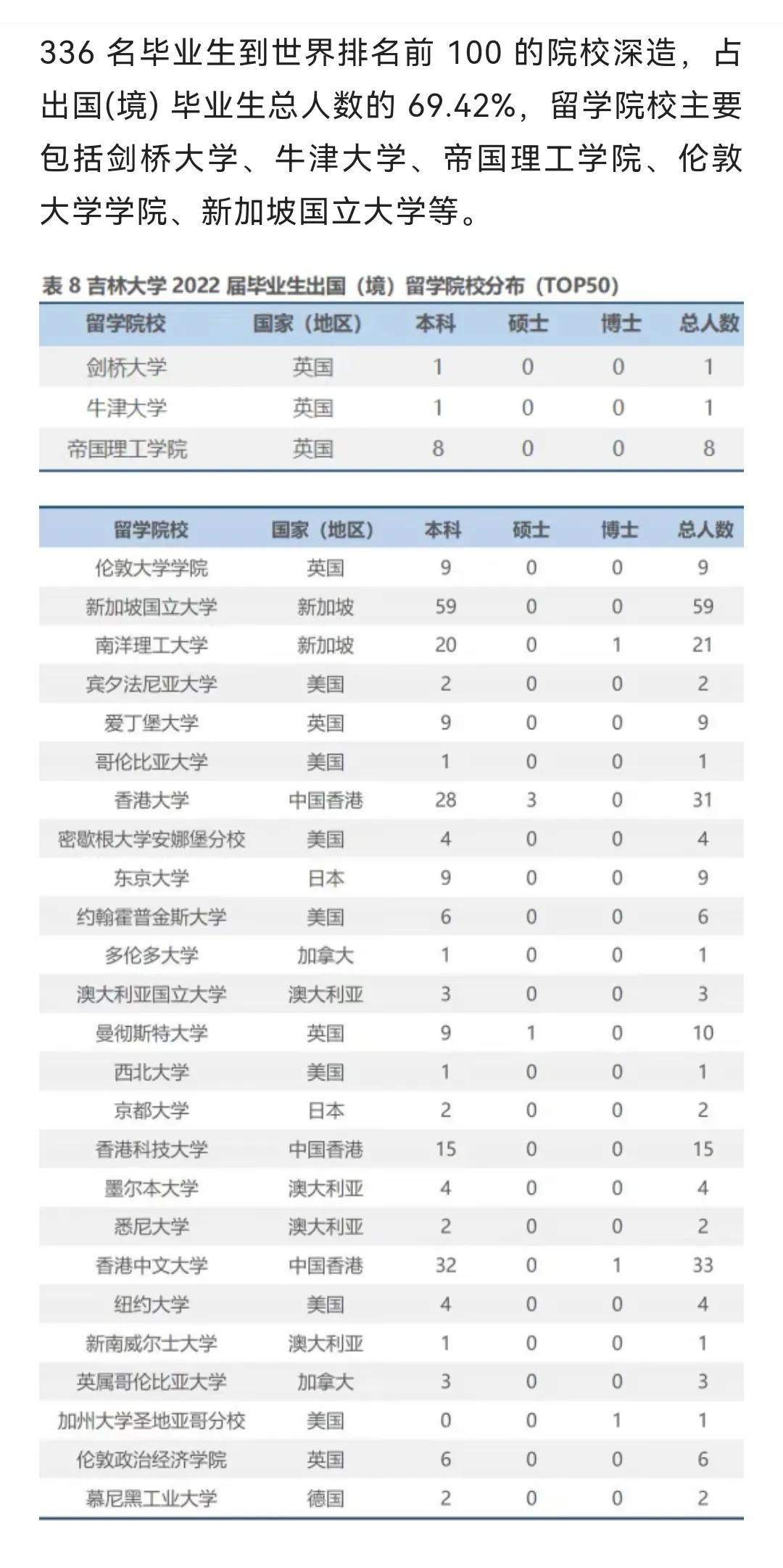 吉林大学2022届425名本科毕业生境外留学院校中,进入QS排行榜top10有19人,占比4.5%;top20有109人,占比25.6%;top50有243人,占比57.2%;top100有336人,占比69.4%。这几组数据,在985大学中并不出色。但相比211和其他双非大学,优势就太明显了。