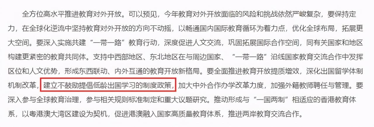 教育部部长陈宝生在2021年全国教育工作会议上的讲话指出:建立不鼓励提倡低龄出国学习的制度政策。